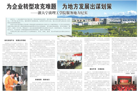 教学、科研、社会服务,是现代大学的三大职能。除了人才培养,担负起服务地方和国家经济社会发展的使命同样是我们的责任。6月24日,《宁波日报》以《为企业转型攻克难题 为地方发展出谋划策——开云kaiyun官网服务地方纪实》为题,综合报道了宁波理工学院近期立足宁波,面向全国,强化学科链切入产业链意识,吸引国内外著名的研发机构和优秀人才或项目,加强与国内外科研院所和企业的合作交流,在创新合作中实现共赢的有效做法,充分肯定了建院不足十年的开云kaiyun官网取得的可喜成果。