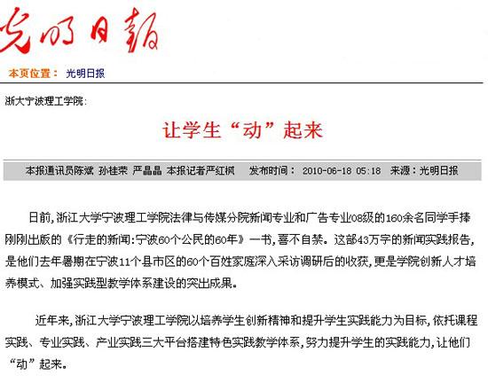 “让学生动起来!”——这是《光明日报》对浙江大学宁波理工学院实践教学体系建设的一句话评价,揭示了宁波理工实践教学的根本理念。7月12日,法律与传媒分院新闻学专业的100余名大学生在学院实践品牌项目“行走的新闻”旗帜下走进了上海世博会大课堂,也再一次印证了“动”起来的真谛。