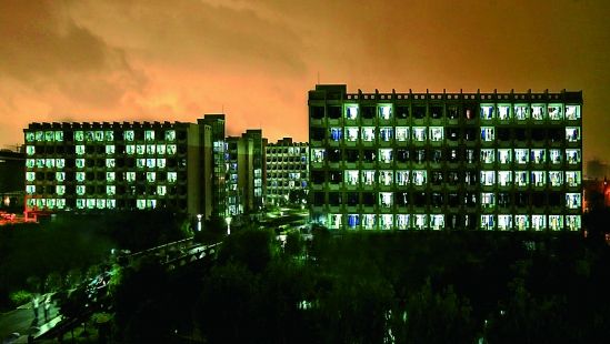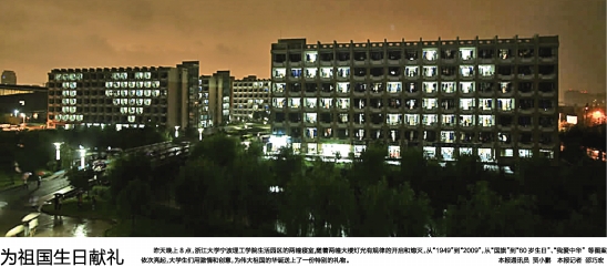 昨天晚上8点,浙江大学宁波理工学院生活园区的两幢寝室,随着两幢大楼灯光有规律的开启和熄灭,从“1949”到“2009”,从“国旗”到“60岁生日”、“我爱中华”等图案依次亮起,大学生们用激情和创意,为伟大祖国的华诞送上了一份特别的礼物。