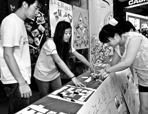 昨晚,浙江大学宁波理工学院“庆祝建国六十周年,共创嘉兴和谐城市”——暑期社会实践活动在市区戴梦得广场举行。活动通过万人签名、图片展出等形式,向市民展示建国六十周年伟大成就和表达建设和谐嘉兴的决心。