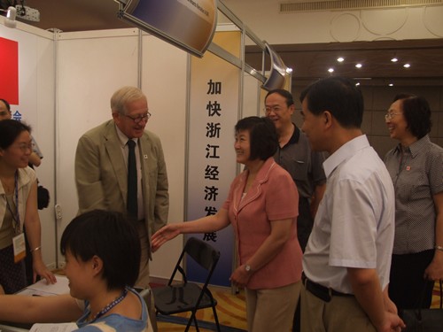 浙江省人力资源和社会保障厅副厅长李为(右四)与外国专家组织代表交谈 |
