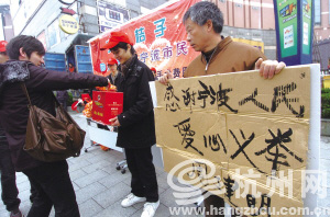 “感谢宁波人民爱心义举”——昨天,在宁波城隍庙卖橘现场,龙游橘农周水甘举着个纸牌,上面以儿子周建明的名义写着这几个大字。