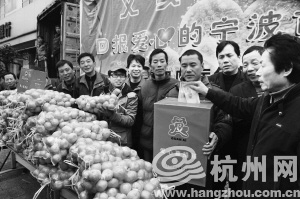 几天前,宁波市抗癌健康基金会工作人员、宁波出租汽车协会的的哥出面,帮助周水甘联系场地车辆,在城隍庙办了这场橘子义卖。而在现场,几位的哥和城管义工、大学生志愿者们一起,吆喝起来。