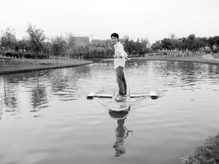 发明这个冲浪艇的小伙叫韩海军,今年刚从浙江大学宁波理工学院毕业。从小在舟山海边长大的他特别喜欢滑水的感觉,一直想着能有一种冲浪板,不需去大海就能冲浪。由于在大学里念的是工业设计专业,他平时有空喜欢搞些发明设计,很多创意还在各类设计大赛上得过奖。