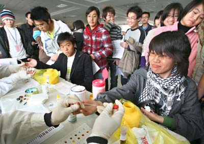 日前,浙江大学宁波理工学院的大学生在积极参加义务献血。当日,在该校一年一度的义务献血活动中,学生们获悉北京奥运会举办之时将稀缺Rh阴性血后,近3000名大学生报名参加献血,其中6名学生被确认为Rh阴性血型,校团委特成立稀有血型者“爱心之家”,这成为大学生为北京奥运作贡献的新亮点。贾小鹏 摄 《中国教育报》2007年12月17日第2版