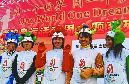 图1:昨天,在浙江大学宁波理工学院 “奥运周”系列活动的启动仪式上,该学院的5名大学生装扮成 “福娃”,一时间成为了同学们瞩目的焦点。 (贾小鹏 张柯)
