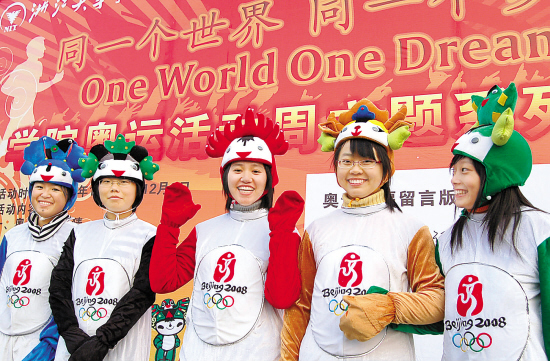 12月3日是浙江大学宁波理工学院“奥运周”系列活动的第一天,该学院的5名大学生装扮成“福娃”,向同学们分发奥运纪念品。 本报记者 蒋勇 通讯员 贾小鹏 摄