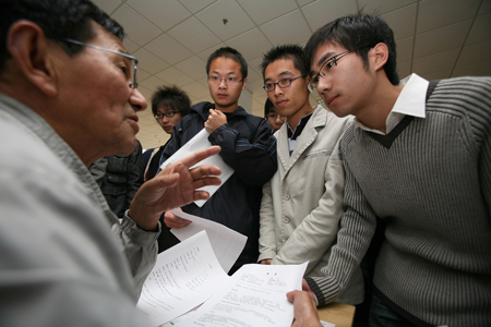 近日,浙江大学宁波理工学院举行2008届本科毕业生校园专场招聘会,百余家用人单位进校设摊招聘,拉开了新学年应届大学毕业生就业的帷幕。图为该校学生在招聘会上正用流利的英语和企业人力资源主管进行交流。