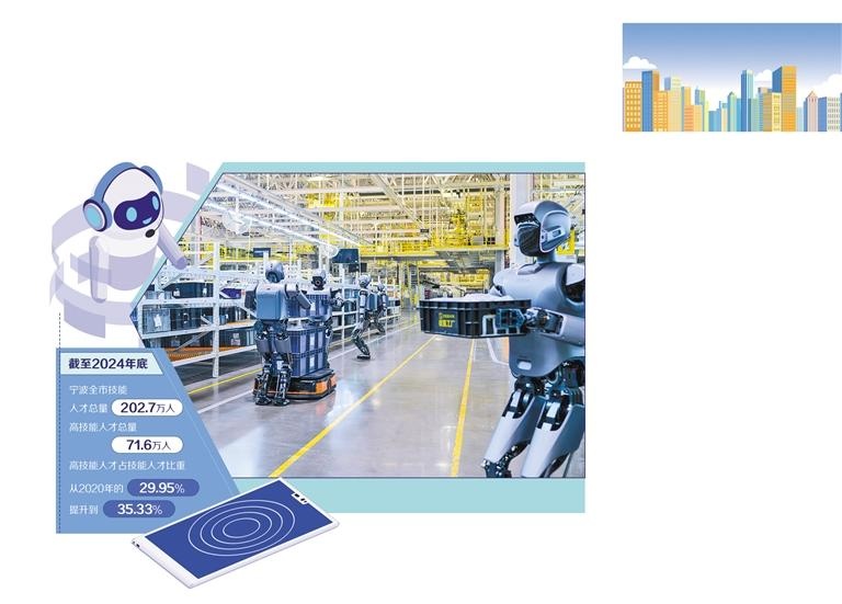 近年来,宁波市始终把技能人才作为支撑产业升级、推动高质量发展的重要引擎,先后出台《关于高水平培育新时代宁波工匠队伍的实施意见》等30余项配套政策,构建覆盖技能人才“引育用留”全链条的“1+N”政策矩阵。截至2024年底,全市技能人才总量202.7万人、高技能人才总量71.6万人,高技能人才占技能人才比重从2020年的29.95%提升到35.33%。
