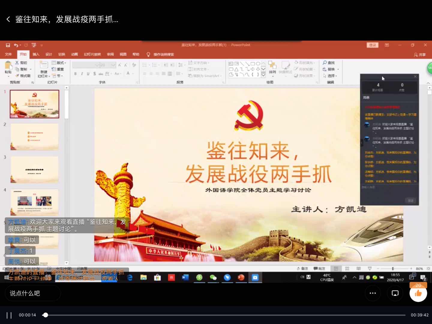 近期外国语学院学生第一、第二党支部在钉钉线上开展“鉴往知来.发展战役两手抓”--习近平新时代中国特色社会主义思想学习活动。学生第一党支部书记芦美丽、学生第二党支部书记刘杜娟参加。