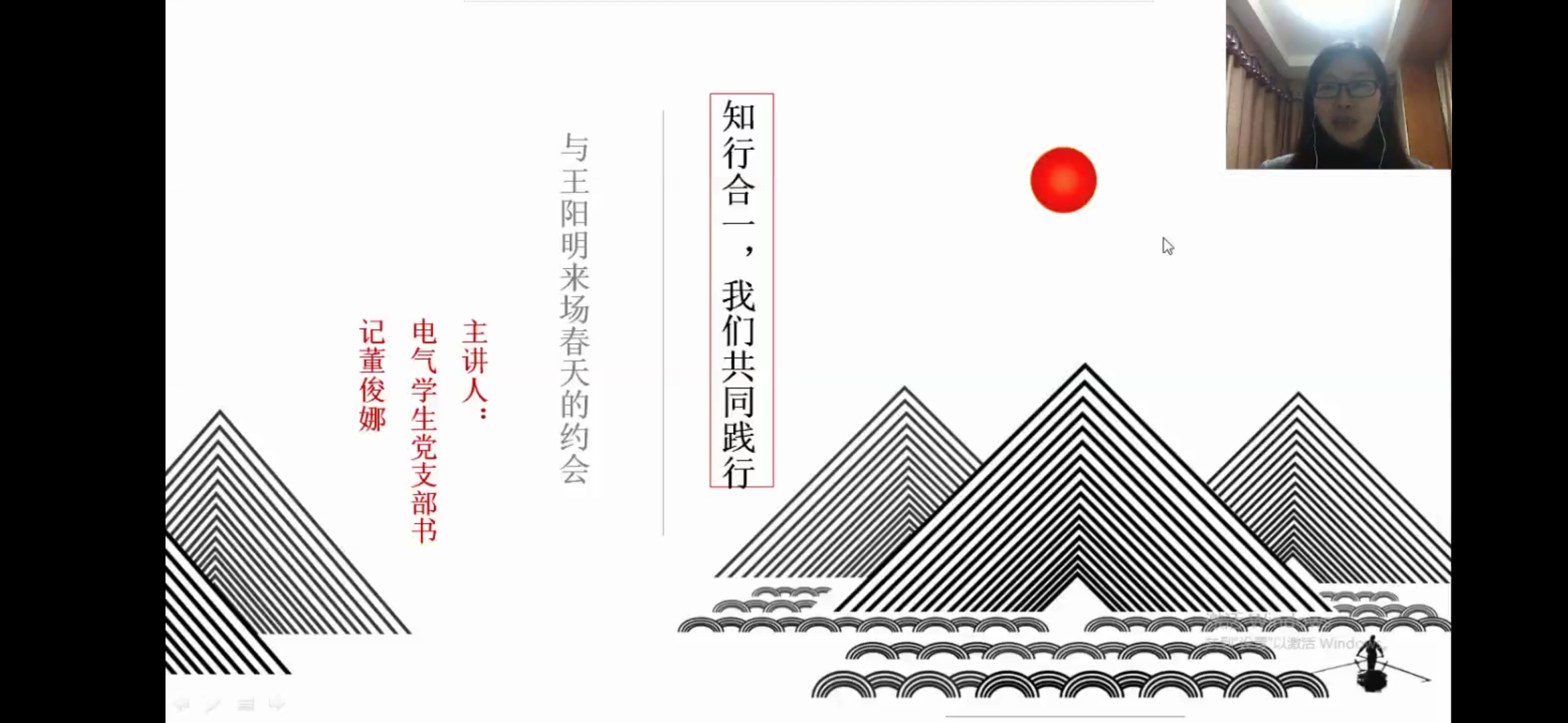 新时代青年大学生肩负着传承优秀传统文化的使命与责任,近日电气学生党支部书记董俊娜开展了“知行合一与王阳明来场春天的约会”的专题党课,课上董老师从阳明心学中的“知行合一”思想延伸开来,分析了其对新时代大学生成长的积极意义。它既是青年大学生追求阳明的“良知”这个最高德行应该具有的“功夫”,也是在专业学习、社会实践以及思想进步上应该借鉴的品质。董老师引用习近平总书记在北大师生座谈会中向青年提出的四点希望,青年要爱国、励志、求真、力行。知行合一不是空口喊话,而是要踏踏实实落到实处,传承优秀中华文化,学习真知,践行真知,勇于担当,勇于作为。青年一代有理想、有本领、有担当,国家就有前途,民族就有希望。