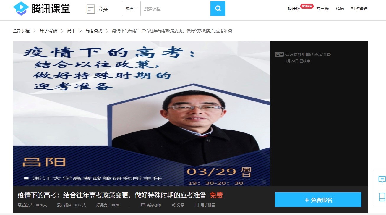 3月29日晚19:30,浙江大学宁波理工学院继续教育学院面对浙江省高考考生专门举办的大型线上公益讲座《疫情下的高考应对:结合往年高考政策变更,做好特殊时期的应考准备》,通过腾讯课堂平台准时开讲。