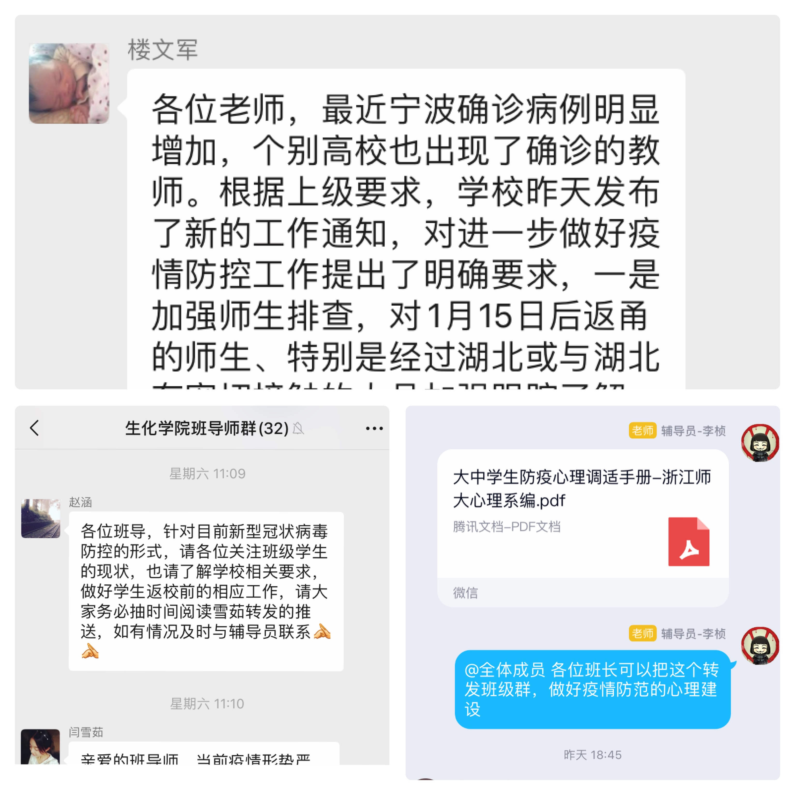 及时反应,压实责任。针对新型肺炎疫情,1月23日上午,学院党政班子紧急召开疫情防控工作部署会,制定多项防疫举措,并落实人员信息每日上报工作。1月29日学院紧急成立新型冠状病毒防控工作专班小组,将疫情防控工作作为重中之重,同时线上成立生化学院疫情防控工作群、疫情防控党员工作群、生化学院防疫志愿者群多渠道开展防疫工作。