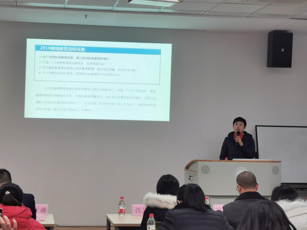 金朝晖对2019年继续教育学院的工作情况做了综述。继续教育学院在过去的一年中,管理制度进一步完善,合作办学的规范化管理进一步加强,学历教育质量和数量双提高,师资培训稳中有升,高质量培训项目积极拓展。