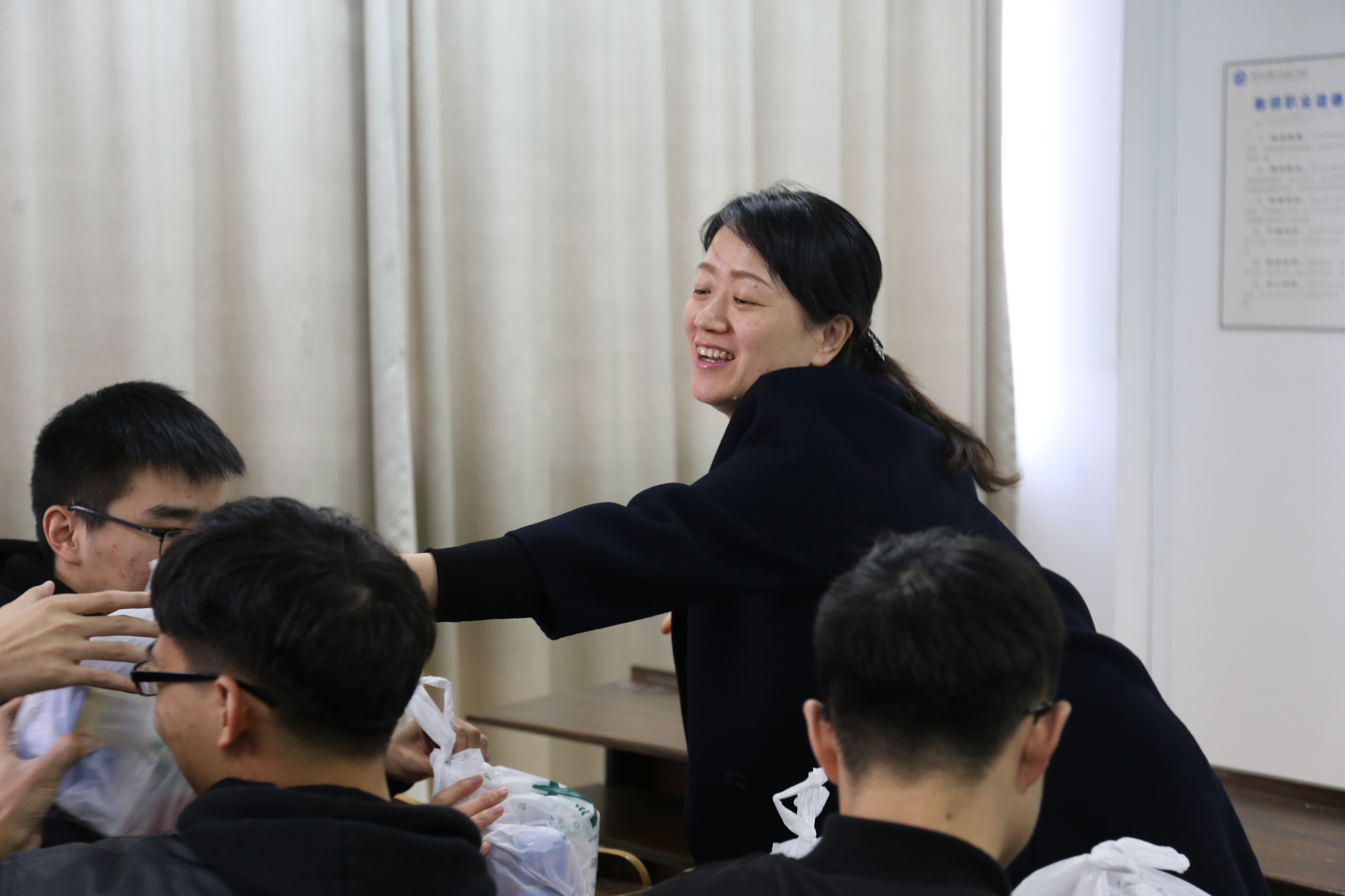 最后领导们为了表达对考研学子的慰问和鼓励,带去了学院精心准备的慰问品,吴春老师和韩缨老师亲自将礼品送到每位学子手上,并告诉考生们注意身体。在这寒风阵阵的冬日,本次活动给同学们送去了无限的温情与暖意,收到礼物的考研学子也纷纷表示感谢,并表示认真备考,诚信考试。