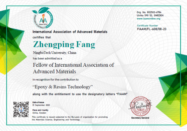 近日,由国际先进材料协会(International Association of Advanced Materials, IAAM)主办的第55届国际先进材料大会(Advanced Materials Congress)在瑞典斯德哥尔摩举行。开云材料学院院长方征平教授被授予国际先进材料协会会士(FIAAM)称号,并受邀做了题为 “Synchronous flame retarding and smoke suppression for epoxy resin”(环氧树脂的同步阻燃和抑烟)的在线大会特邀报告。