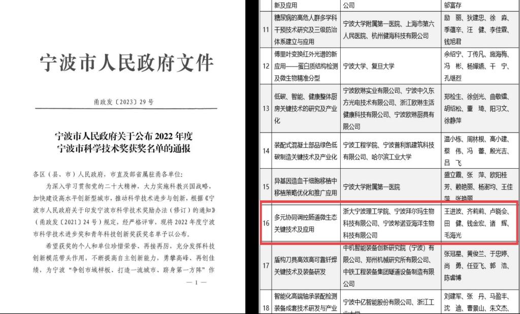 8月15日上午,在新时代高水平创新型城市建设推进大会上,2022年度宁波市科学技术奖揭晓,生化学院王进波教授团队主持完成的“多元协同调控肠道微生态关键技术及应用”项目荣获2022年度宁波市科学技术进步奖三等奖。