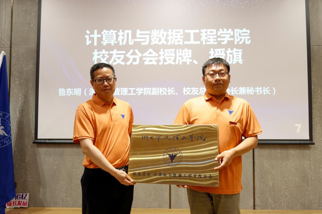 在热烈的掌声中,鲁东明为数据校友分会授牌、授旗,学校组织部部长、校友总会副会长周树红为数据校友分会新当选的会长、副会长等颁发聘书。