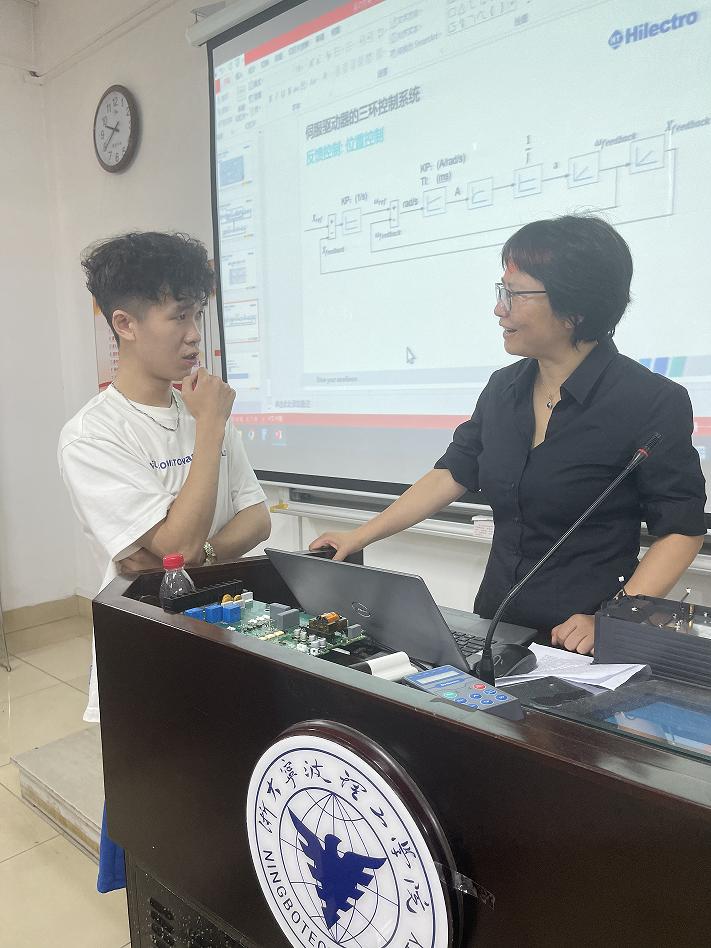 接着,张新梅分别给自动化、电子信息工程专业学生讲授“现代控制理论”和“数字信号处理”这两门专业核心课,课堂上,张新梅介绍了驱动器发展、研发设计、伺服驱动器的三环控制、数字信号处理技术等,并给学生展示讲解设备实物,理论结合实际,让学生对“控制”、“信号”等概念有了更深的理解。