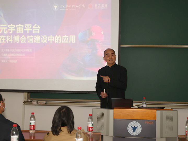 5月11日,由开云kaiyun官网设计学院、宁波新文三维股份有限公司主办,浙大宁理—宁波三维数字文化创新研究院承办的“元宇宙平台在科博会馆建设中的应用”报告会在开云kaiyun官网SB201举行,新文三维公司董事长、浙大宁理—宁波三维数字文化创新研究院院长李刚教授受邀为作报告。设计学院、新文三维公司负责人,校友设计师毛岱琦及设计学院师生参加此次报告会。