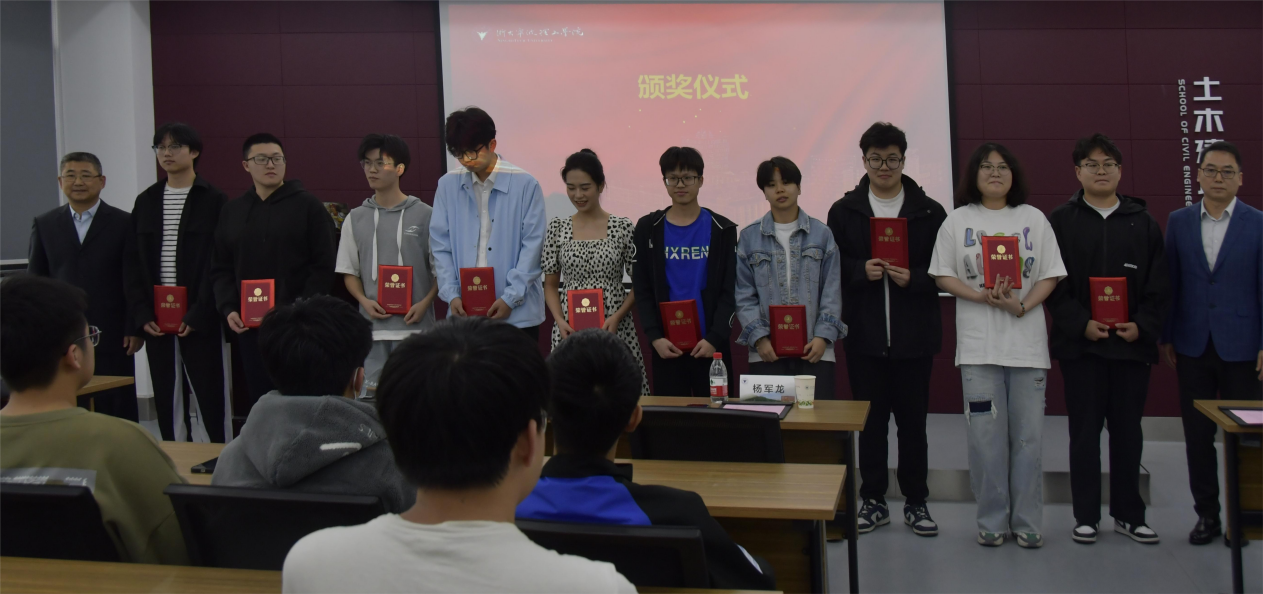 土建学院党委书记刘群娣宣读获奖名单。杨军龙总经理、王国鸿副总经理、王银辉院长、刘群娣书记分别为获奖同学颁发获奖证书并合影留念。