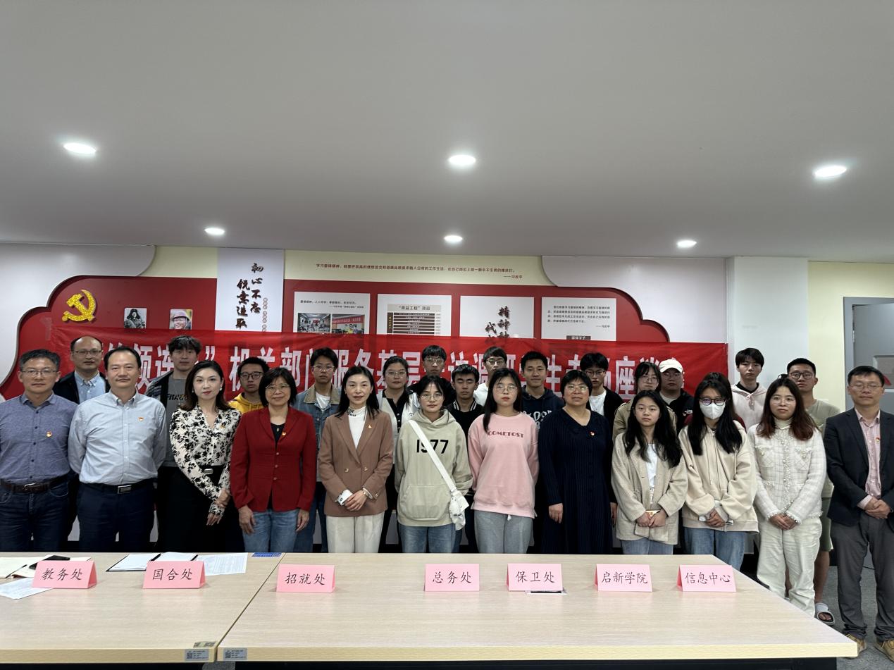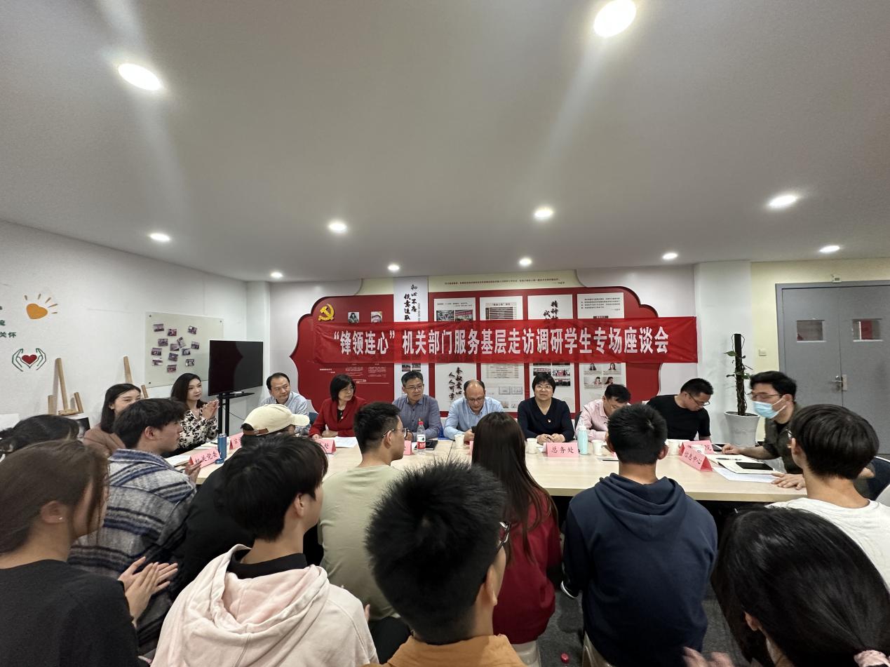 为扎实开展学习贯彻习近平新时代中国特色社会主义思想主题教育,深入开展“大走访大调研大服务大解题”活动,打通机关部门教育管理服务师生“最后一公里”,4月28日下午,宣传部、学工部、教务处、国合处、招就处、总务处、保卫处、启新学院、信息中心等相关职能部门单位主要负责人深入学生生活园区,开展服务学生走访调研座谈会。本次座谈会由机关党委主办,学工部党支部承办,来自全校10个学院的20名学生代表参加座谈会。