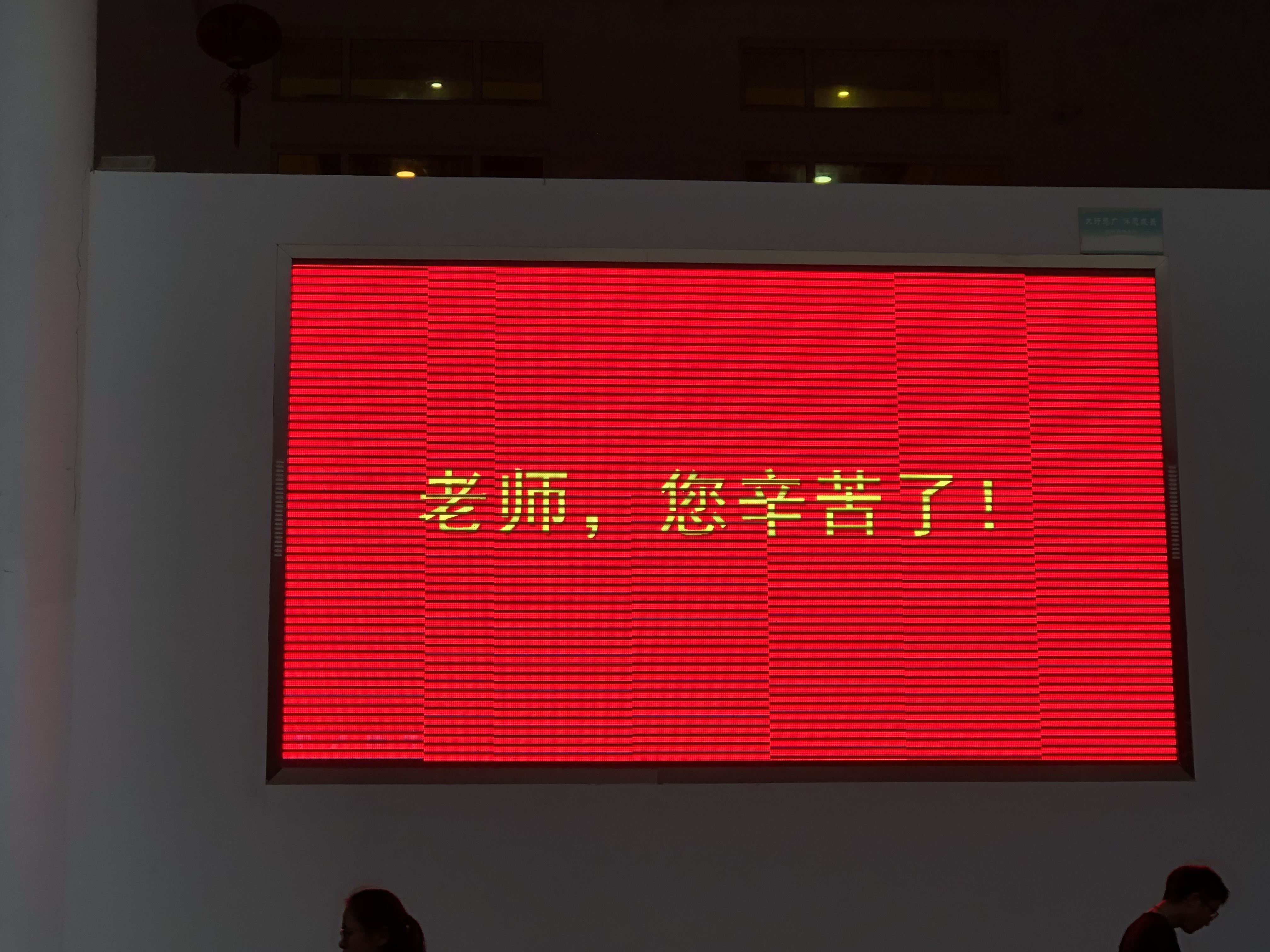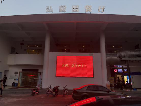 当日早上9点至晚上9点,学校在弘毅园餐厅LED屏等地方滚动显示“老师,您好!”“老师,您辛苦了”等醒目字幕。