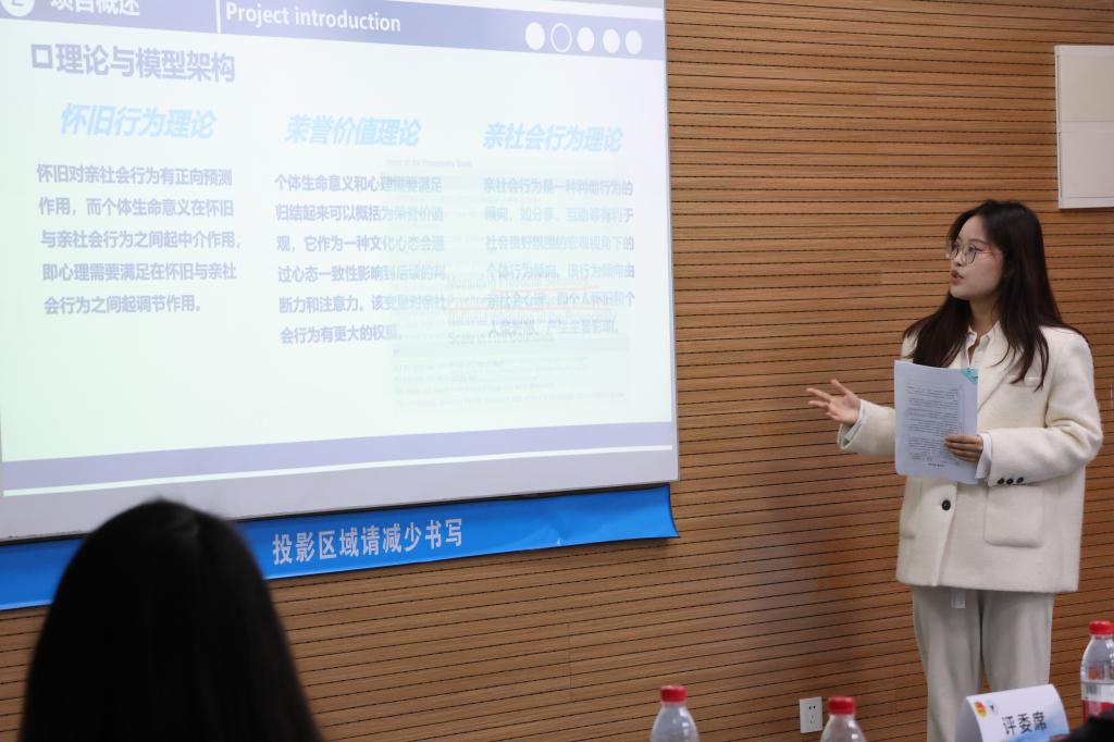 NB104会场,13个哲学社会科学类项目进行答辩。陈述时,团队成员自信登台,逻辑清晰;答辩时,每一位同学都认真听取专家评委老师的建议,从而认识到自身的优势和不足。各项目团队通过实地调查、调查问卷等多种方法,运用科学的理论进行统计分析,有的还通过得出的研究结果向企业或政府建言献策。