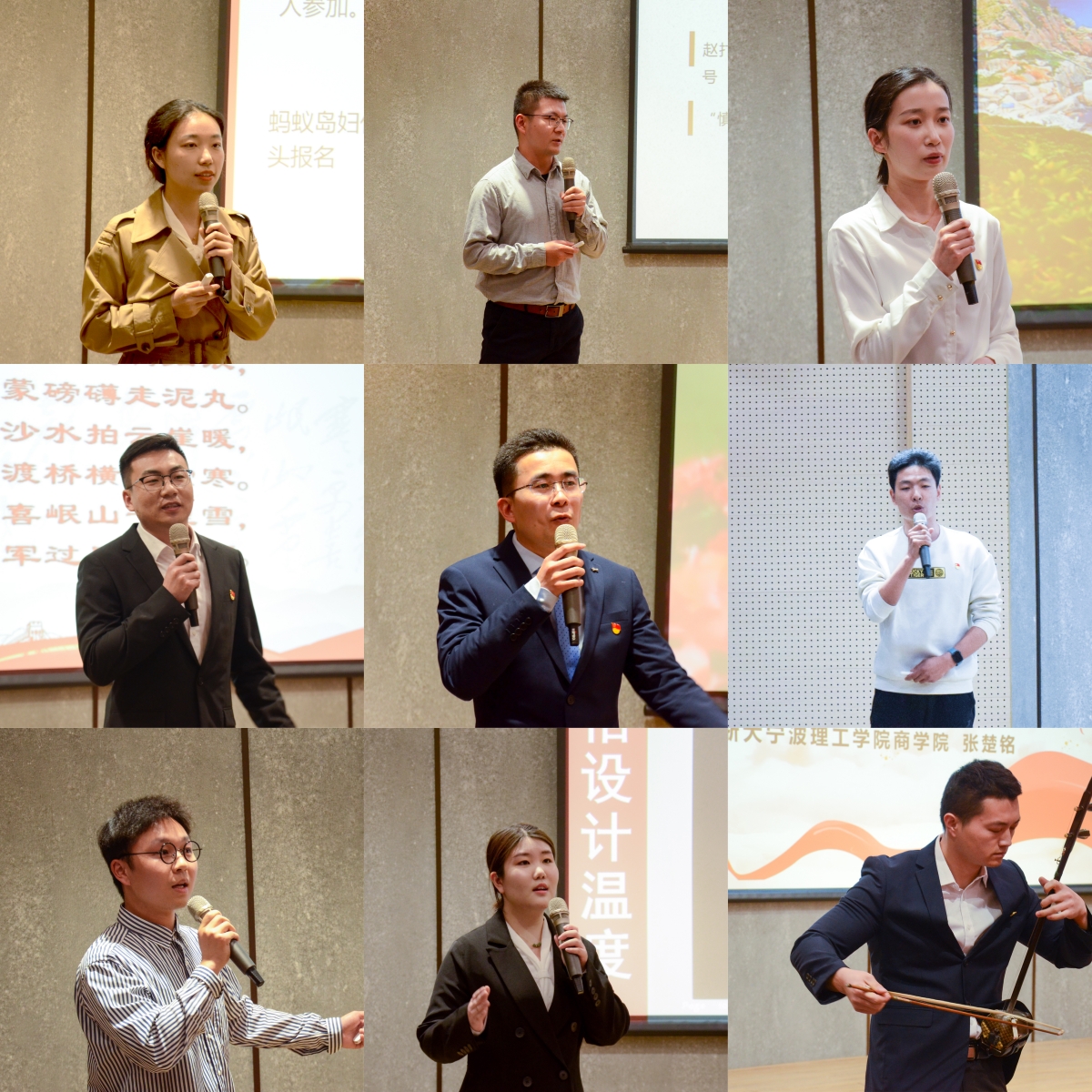 芦敏敏通过蚂蚁岛妇女建造“三八海塘”的故事,展现“敢于斗争、善于斗争”强大精神力量;梅呈龙用《满江红》开场,讲述“浙里青廉”崇廉向廉的文化;张梦驰结合学习体育专业的经历讲述体育强国发展中的奋斗故事;黄振彪讲述不同历史时期的长征弘扬长征精神;翁苏桐以家乡舟山跨海大桥修建为例,解读八八战略的富民强市;钟垚用宁波图书馆的故事折射浙江精神共富;张楚铭用农村文化礼堂赋能乡村发展的故事动员青年们努力成为光、追随光、散发光;来自余姚的马炜栋以“红、绿、彩”三色讲述习近平总书记两次回信的横坎头村发展历史;高雅姝用三个设计学生成长故事表达“一颗红心永向党,一方设计暖人心”的坚定信仰和忠诚实践。