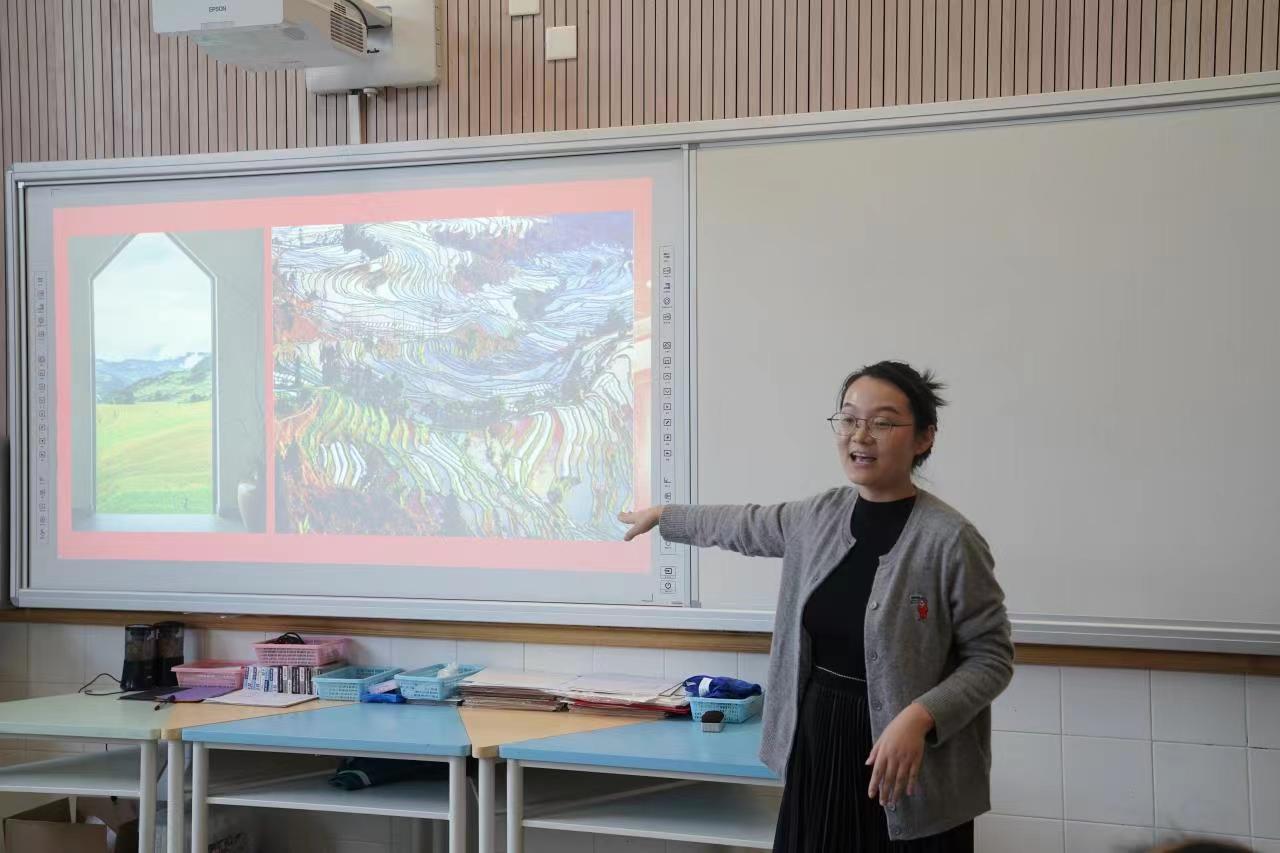 鲍圆洋带领同学们欣赏了大自然不同场景下形态各异的自然肌理。“从艺术家作品中感受艺术家们在‘大自然中去创作’”,鲍圆洋启发同学们,“大自然拥有艺术创作所需要的一切元素,只要你睁大眼睛去观察。”