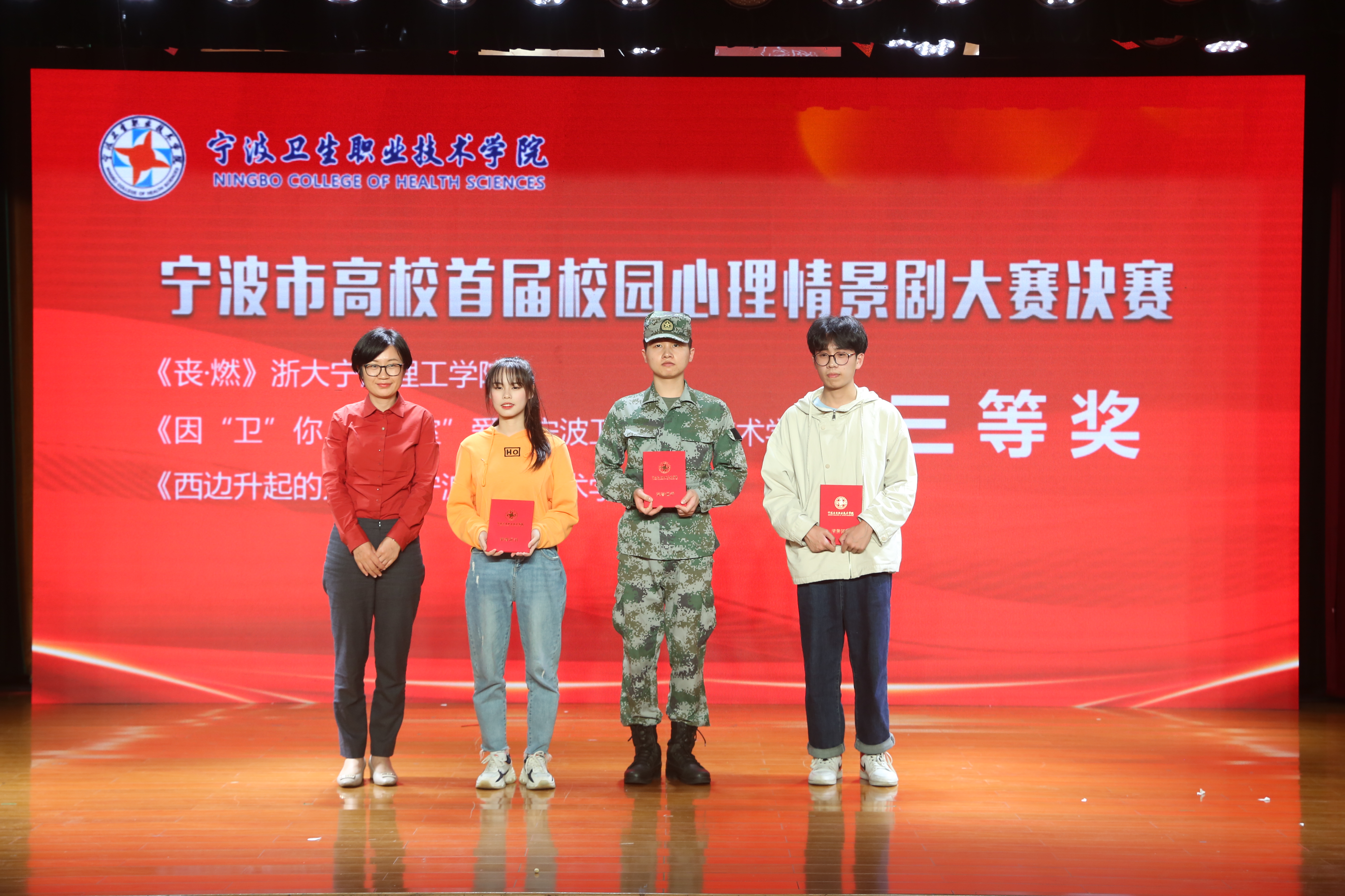 5月25日下午,“凝心聚爱,奔向未来”宁波市高校首届校园心理情景剧大赛在宁波卫生职业技术学院举办。本次大赛由宁波市教育局主办、宁波卫生职业技术学院等单位承办、宁波大学心理健康指导中心及现代金报社协办。全市共11个剧目参加初赛网络展示,最终6个作品进入决赛,经过激烈的网络投票与专家评审,开云选送的心理情景剧作品《丧.燃》荣获大赛三等奖。