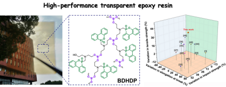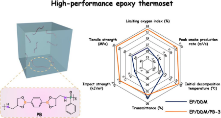 我院团队设计合成的两款阻燃剂因其磷-硼协同阻燃效应,能够在低添加量下(≤3wt%)赋予环氧树脂优异的阻燃及抑烟性能(极限氧指数> 31%,UL-94 V-0级,总烟释放量降低约20%)。同时,低聚物型阻燃剂的加入显著提升了环氧树脂的力学强度及韧性,并且保持其透光性。这两项工作提供了一种合成多功能含磷阻燃剂的有效策略,可用于制备高性能火安全环氧树脂,在电子电气、交通和建筑等领域具有潜在的应用前景。