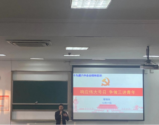 12月17日下午,土木建筑工程学院在SC113召开全体学生党员、积极分子大会,开展党的十九届六中全会精神“六学六讲”宣讲。学院党委副书记邬旭东以“响应伟大号召 争做三讲青年”为题,面向学院全体学生党员和入党积极分子宣讲党的十九届六中全会精神。