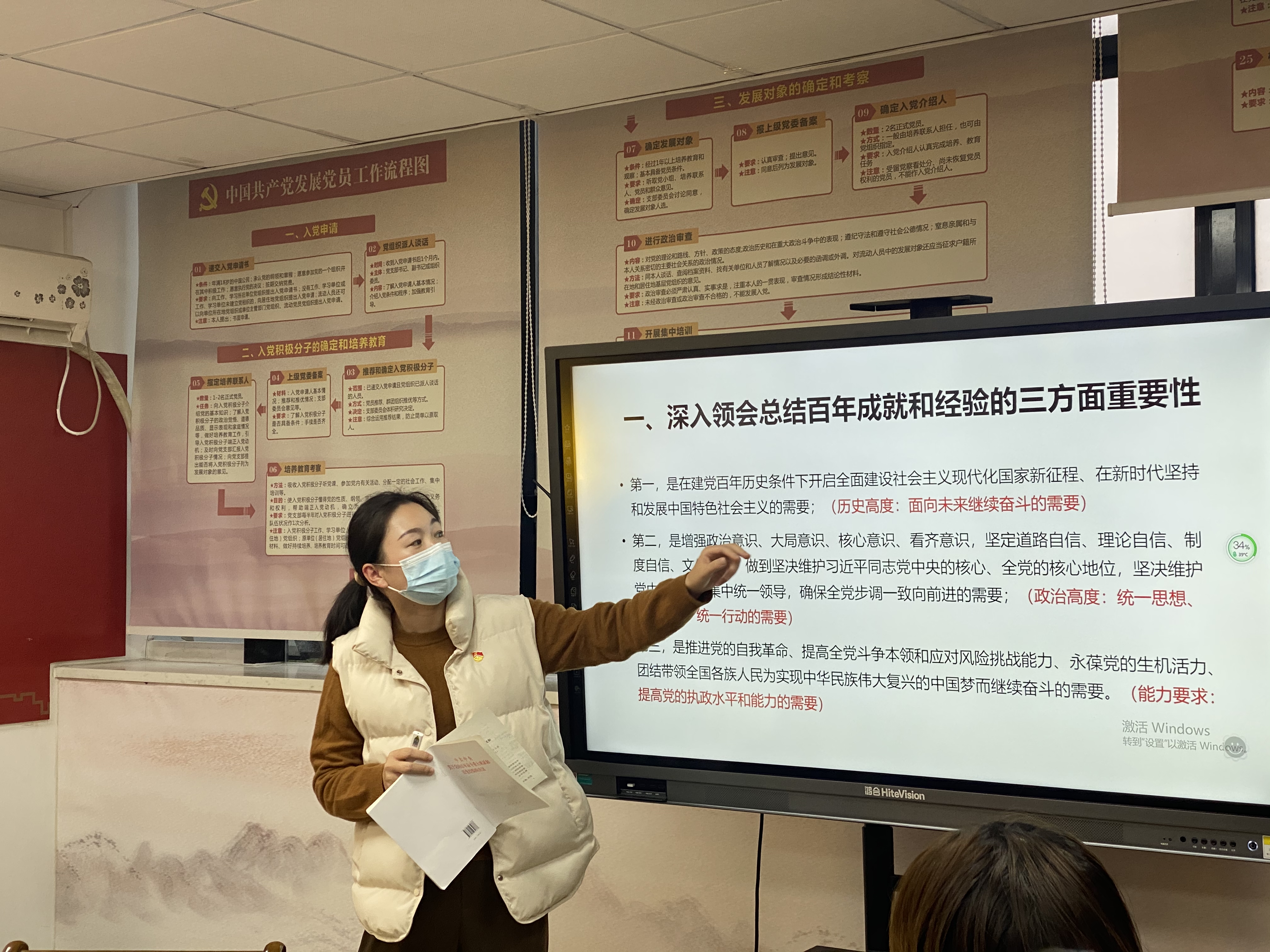 在周星的带领下,支部党员进一步学习了马克思主义中国化的发展历程,明确了党的百年奋斗重大成就和历史经验的各个要点,进一步拓展了对党史的认识。会后,支部党员一致表示,今后将继续深入贯彻学习党的十九届六中全会精神,从党的百年奋斗历史中汲取经验和力量,以实现中华民族伟大复兴为己任,增强做中国人的志气、骨气、底气,不负时代,不负韶华,不负党和人民的殷切期望。