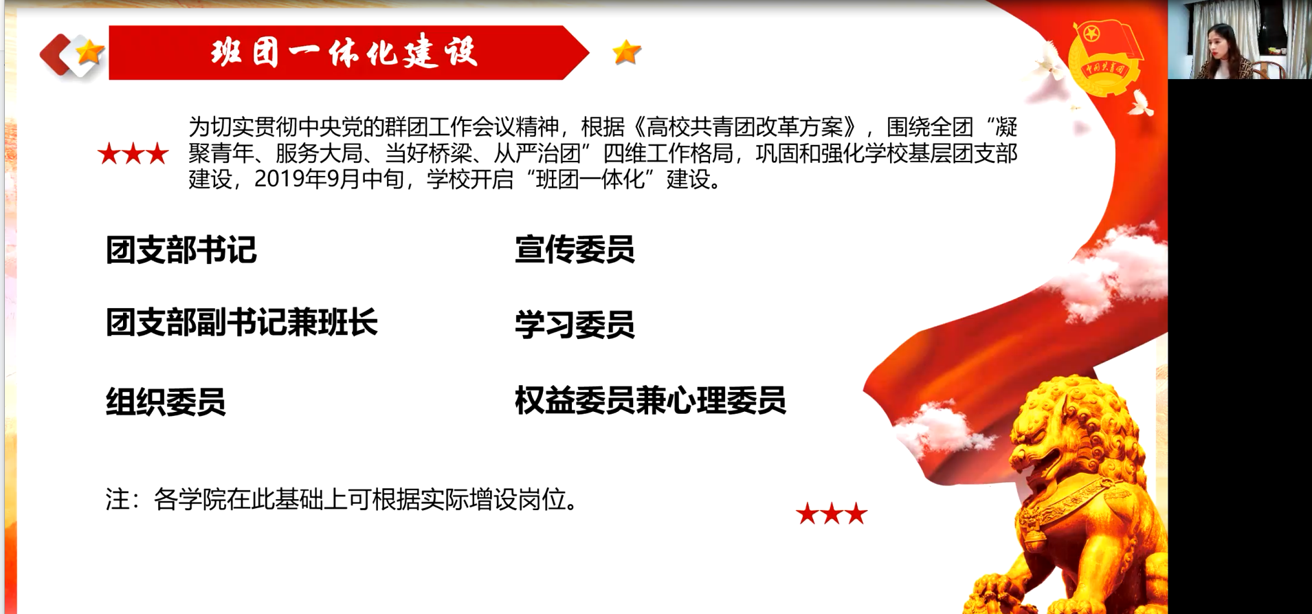学校团委业务副主管陈艳为新生团支委们带来了《团支委的职责与建设》课程。陈艳从“2019年下半年,学校正式推出班团一体化建设”工作入手,着重强调“什么是团支部”“什么是团的支部委员会”“团支委的工作任务和原则”三大方面。课程中,陈艳结合学校基层团支部中涌现出来的品牌团支部、特色团日活动为典型案例,从团支部的思想组织建设、班级建设和实践活动三个方面详细阐述了不同内容的工作要求、工作路径和创新路径,并以“合作、主动、服务”三个关键词明确了团支委工作的三大原则,深化了同学们对团支部和团支委的认识。随后,陈艳从思想建设、班级建设、实践活动三方面详细阐述了团支委未来可以继续努力开展的工作方向,并以合作、主动、服务三个关键词明确了团支委工作道路中的三大原则。