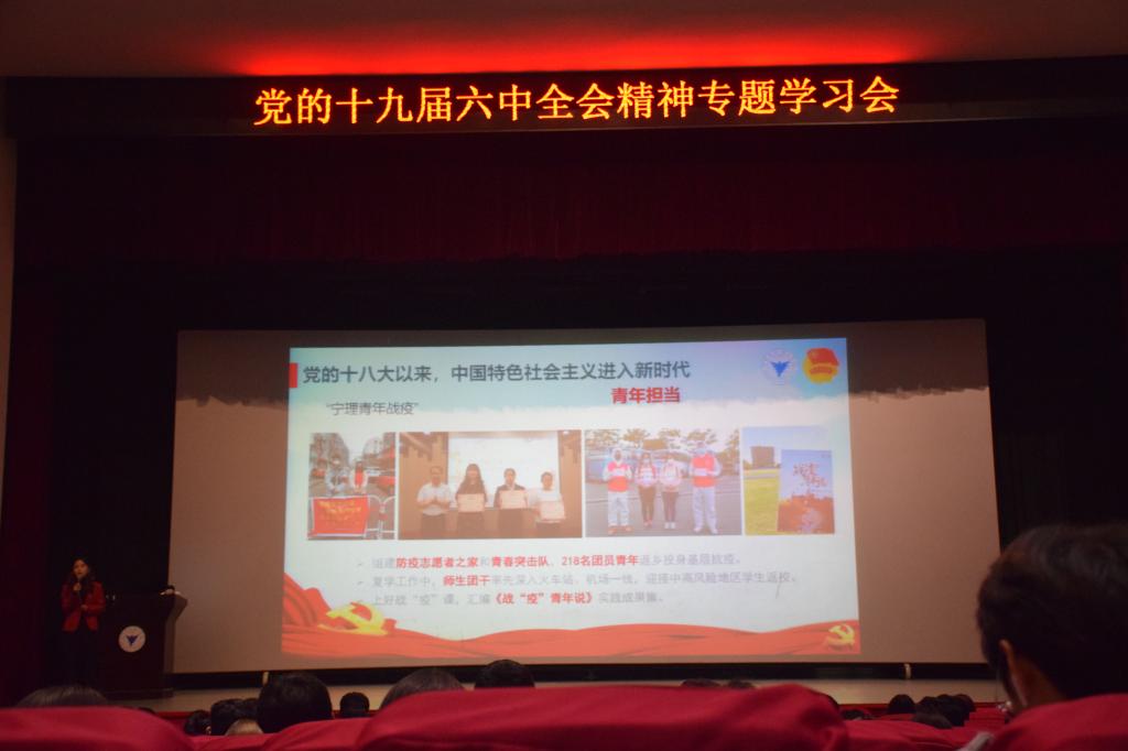 开班仪式结束后,学校团委业务副主管陈艳老师为全体学员带来《党的十九届六中全会精神专题学习》,她围绕“十九届六中全会概况”“为何要总结党的百年奋斗重大成就和历史经验”“四个问卷、四个答卷”“百年答卷的恢弘意义”“百年答卷的经验启示”全面解读了会议内容,并对同学们提出三点要求:坚定理想信念,增强青年志气;勇担时代责任,增强青年骨气;练就过硬本领,增强青年底气。宁理青年应当从党的百年奋斗路中汲取青春力量,把个人发展融入到学校的发展、祖国的建设中,书写新时代的历史答卷!