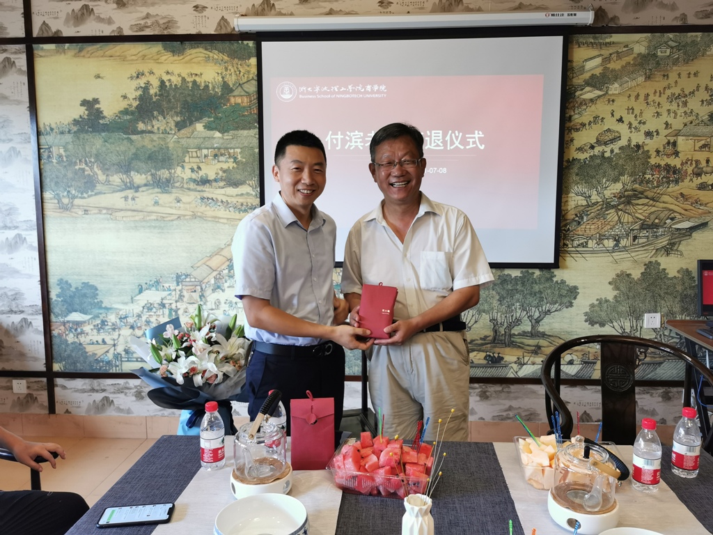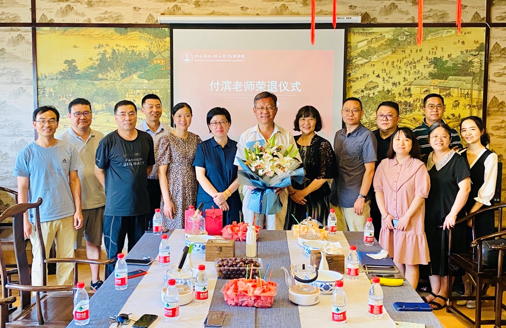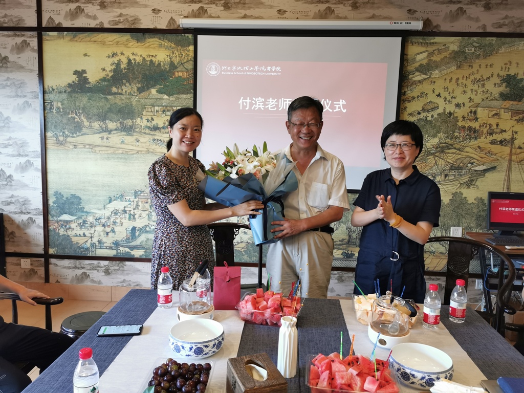 7月8日下午,商学院在大益爱心茶室举办了付滨老师的荣退仪式。学院院长肖文、党委书记李萍萍、学院副院长鞠芳辉、党委副书记周丽娟、工会主席朱红及学院教师代表参加了此次仪式。