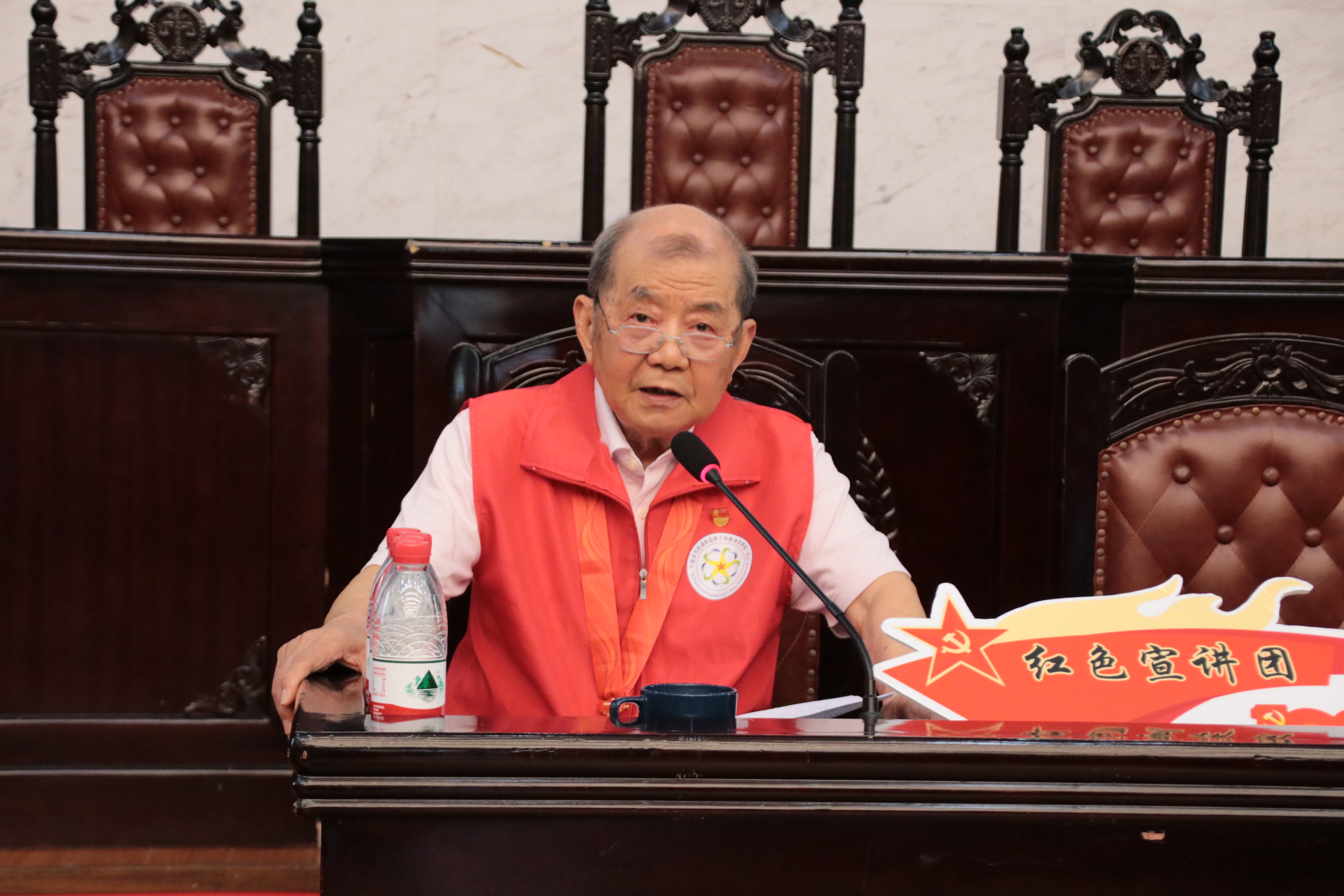 黄学祚同志则向大家讲述了抗美援朝时期风餐露宿的艰苦军旅生活以及一幕幕扣人心弦的战场故事。他提到,参军多年来,他目睹了许多英烈为党为人民冲锋陷阵、无私奉献的场面,我们今天的幸福生活,是与革命先烈的付出密不可分的。最后,黄学祚同志向大家表达了自己的美好祝愿,希望大家时刻保持共产党人的信仰,努力奋斗,成为国家栋梁。黄学祚同志今年86岁,16岁未到入伍年纪却冲破壁垒参军为国,黄老坚持站着演讲,他的不怕吃苦、不怕流血、不怕牺牲的精神震撼了在座的所有人。