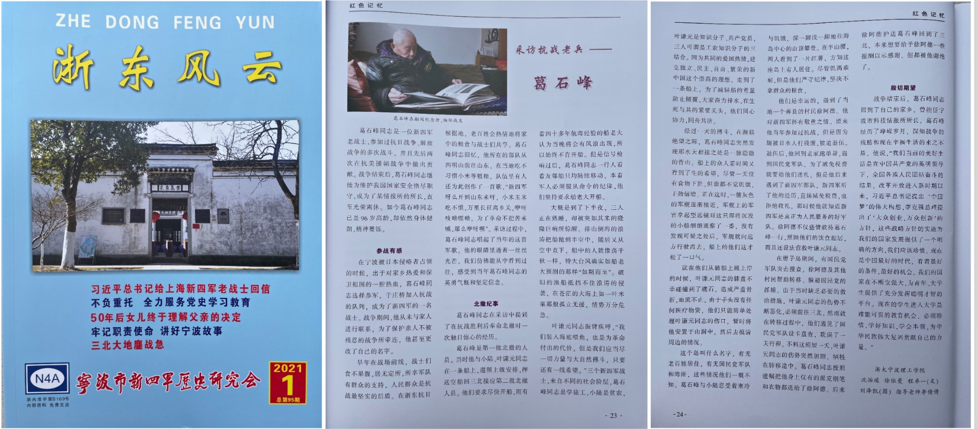 开云传媒与法学子程卓一、沈怡遥、徐依曼等在宁波市新四军历史研究会会刊《浙东风云》中发表了《采访抗战老兵葛石峰》一文,刊发在2021年第1期的“红色记忆”版块,此文由传法学院思政辅导员李倩倩指导写作。在中国共产党建党100周年来临之际,传媒与法学子通过对话抗战老兵,重温历史故事,传承红色基因,厚植爱国主义情怀。