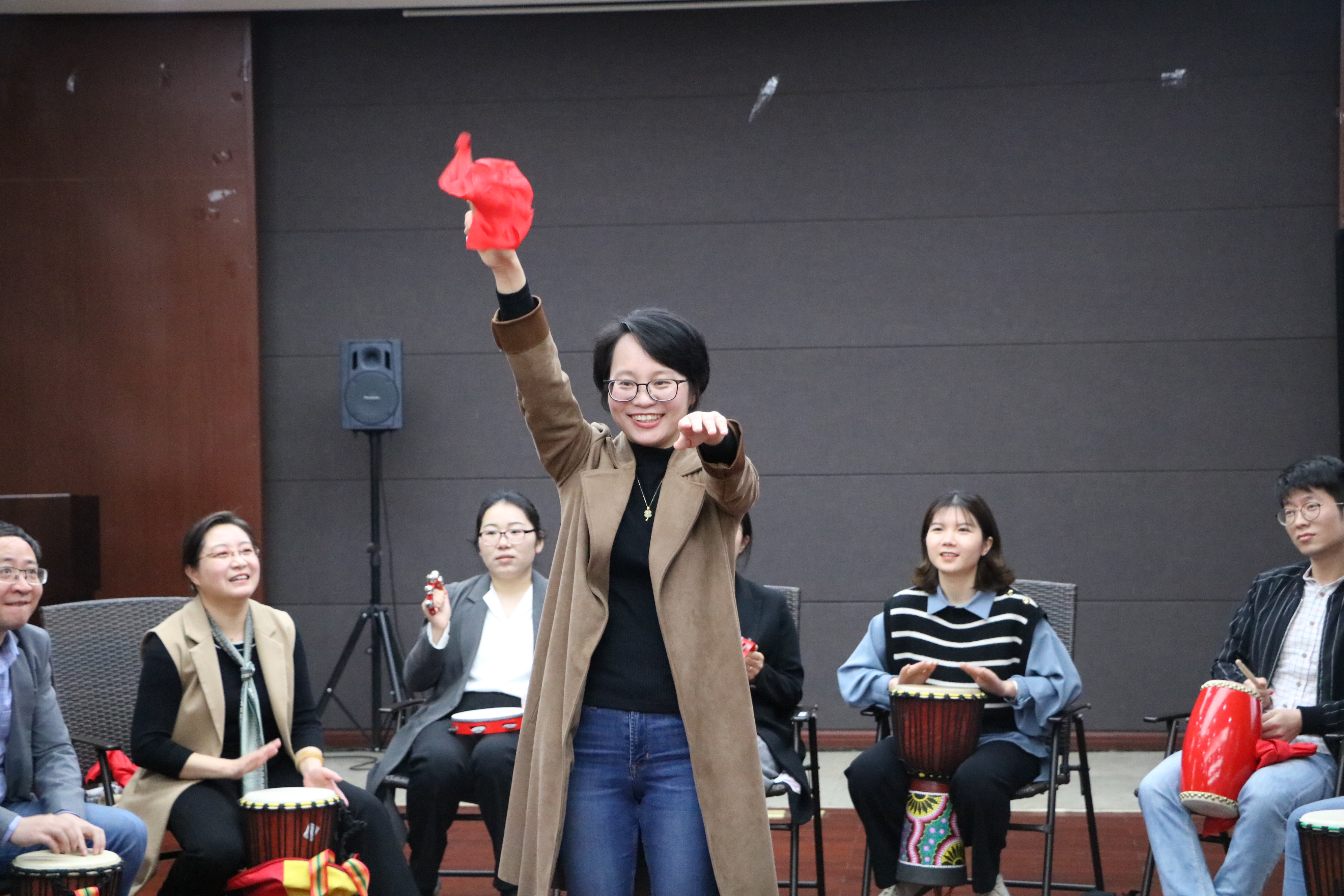 活动现场,老师们围坐一圈,手上拿着各自挑选的乐器作为对话工具。首先由朱小红老师进行示范,运用手势和语言变换进行引导,各位老师跟随朱小红的节奏时而击打乐器,非常具有默契的时而击打、时而停止、时而鼓声齐鸣,气氛热烈。互动环节中各位老师轮流上台,运用不同的方式引导,变换大家手中乐器的节奏,活动现场不时地爆发出欢快的笑声。最后参加团辅的老师们敞开心扉谈了自己的感受。大家都表示通过“鼓圈”紧绷的心情得到了舒缓,急切澎湃的鼓声宣泄出了自己长时间高强度工作的心理压力和负能量,得到了有效的减压。朱小红总结发言时,结合自己的工作经验,给各位老师们分享了自己的工作心得。她表示,无论我们的工作压力有多大,面对的困难有多少,我始终相信办法一定比困难多,一定要保持初心,坚持原则,言行一致。