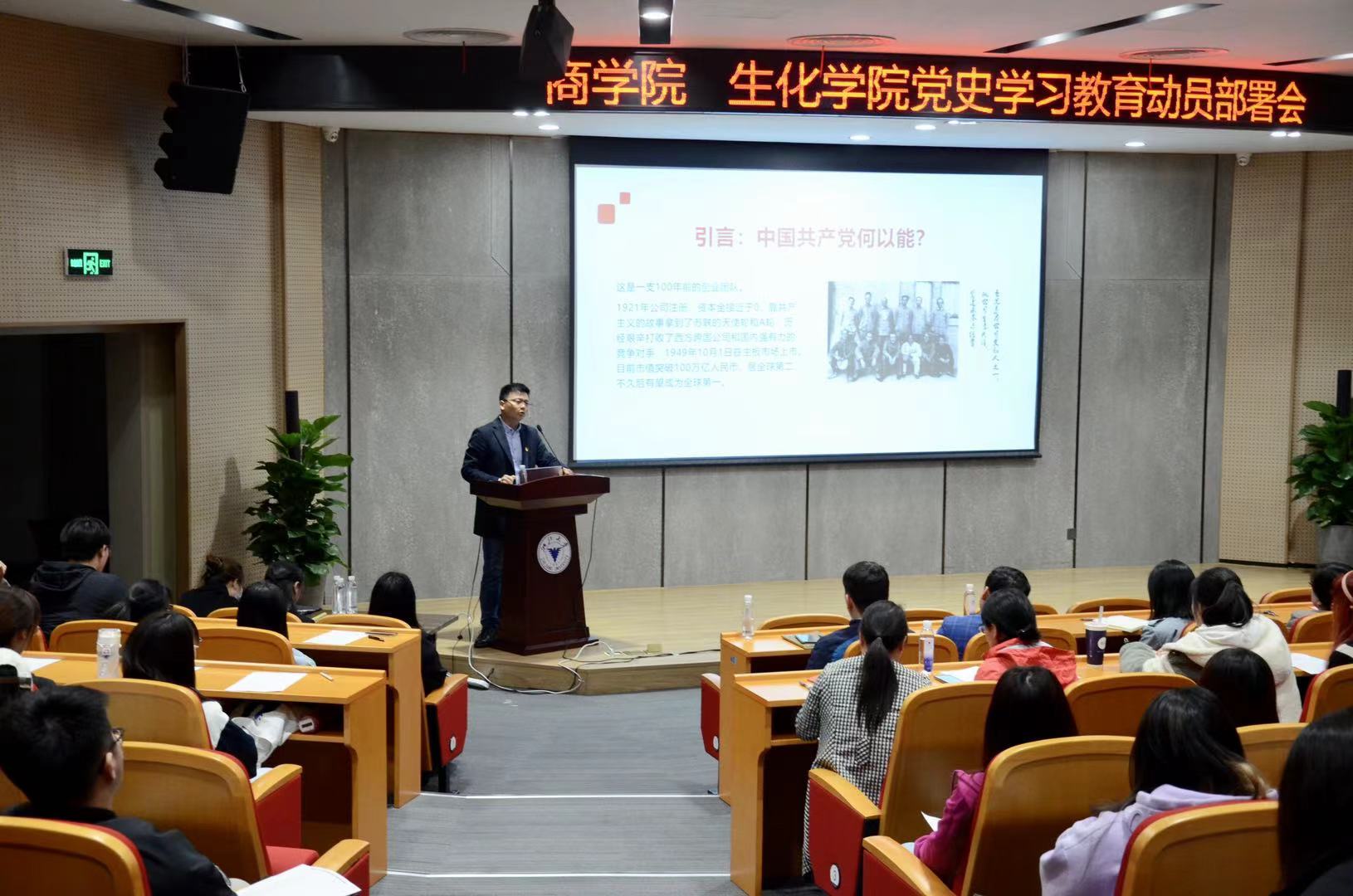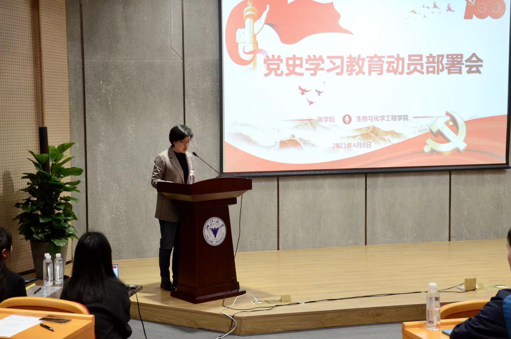 李萍萍作党史学习教育动员部署,对党史教育的总体安排,及党史专题学习、党史专题宣讲、党史专题宣传教育、党史专题实践等四个方面主要任务进行详细部署。她强调,要从全党的高度来认识、领会党史学习教育的重大意义,更要结合学校、学院发展实际来践行这个重大意义;她指出商学院、生化学院的学科专业和学院规模虽有明显差异,但我们同处于学校发展的关键时期,面临硕士点申报、一流专业建设、本科教学评估等同样艰巨的任务,我们要通过党史学习教育补齐短板、凝聚力量,实现高质量发展。她要求,党史学习教育要统筹规划、系统推进,把党史学习教育与庆祝建党100周年系列活动、庆祝建校20周年系列活动结合起来;要突出重点、彰显特色,将党史学习教育和商学院与东钱湖镇党委结对共建、生化学院三个学生党支部“时代楷模”“甬籍院士”“西迁人物”三部曲系列微党课等党建特色有效衔接起来;要加强交流,取长补短,两个学院党支部可共同开展支部党日活动,开展学院党史学习教育经验交流等,共同提高党史学习教育成效,为“十四五”起好步、开好局提供强大精神动力。