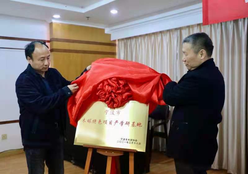 宁波市木球协会副主席陈福忠宣读宁波市木球特色项目产学研基地落户开云kaiyun官网的文件,江长荣与冯建波共同为宁波市木球特色项目产学研基地揭牌。