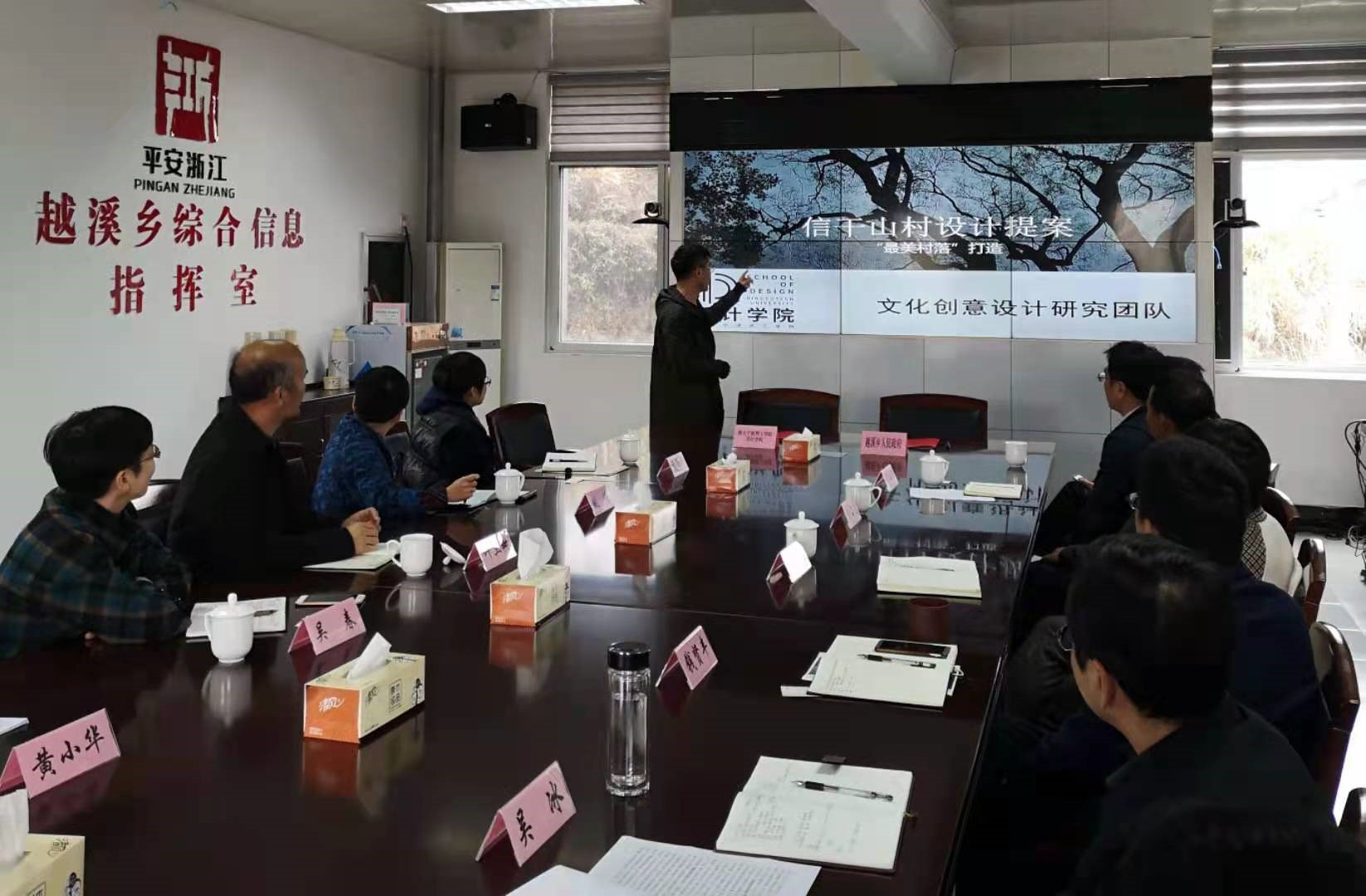 黄小华带领的文化创意设计研究团队通过对越溪乡信干山村前期调研考察,在此次座谈会中给出了信干山“最美村落”打造的设计提案,包括村落沿路的旧物改造、墙绘比赛、村落花房、网红美景打卡点、土特产包装等,提案内容得到越溪乡村领导的一致肯定。