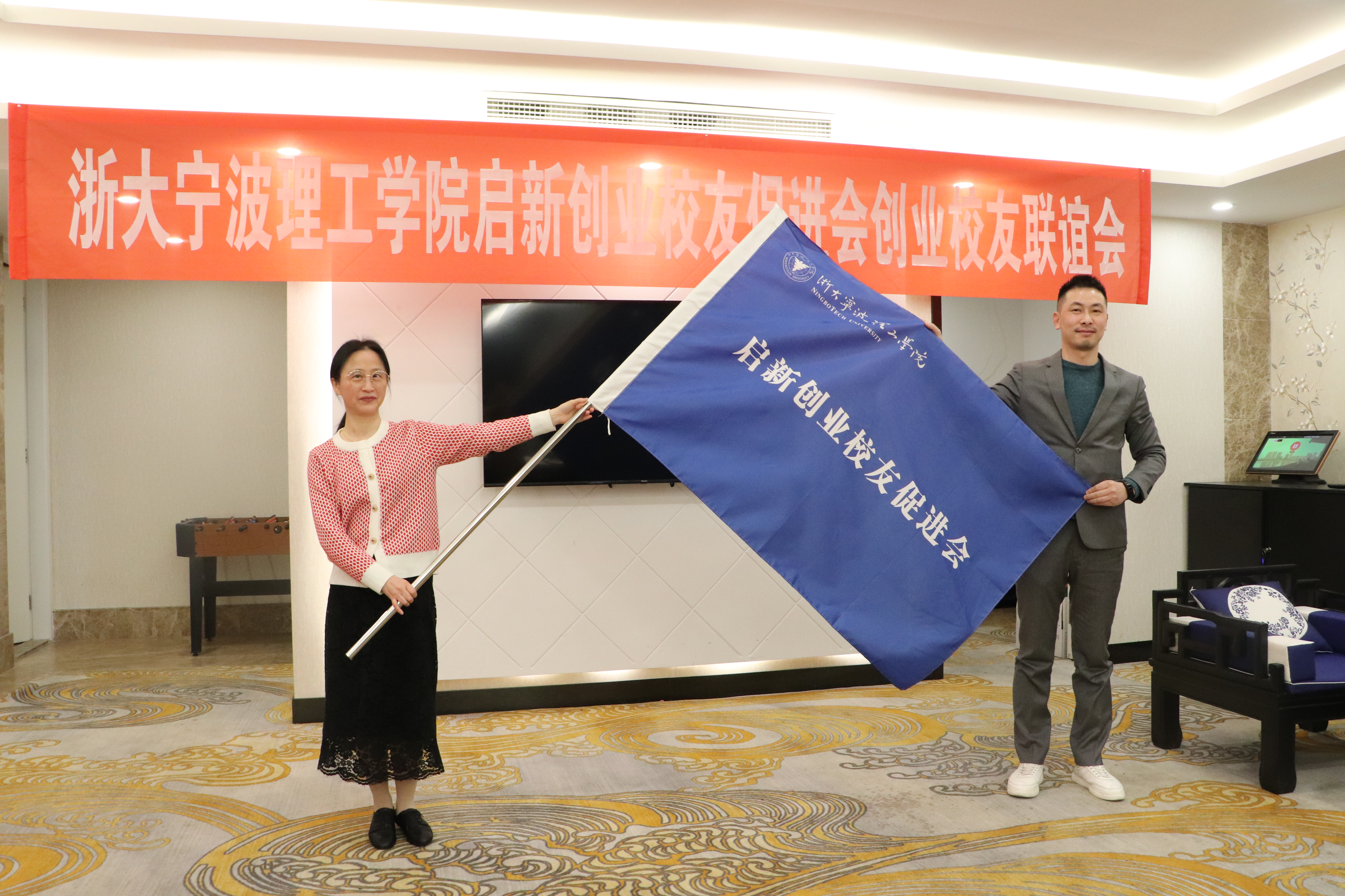 戴革萍向促进会创业校友代表、启新创业校友促进会副会长林博峰授旗。