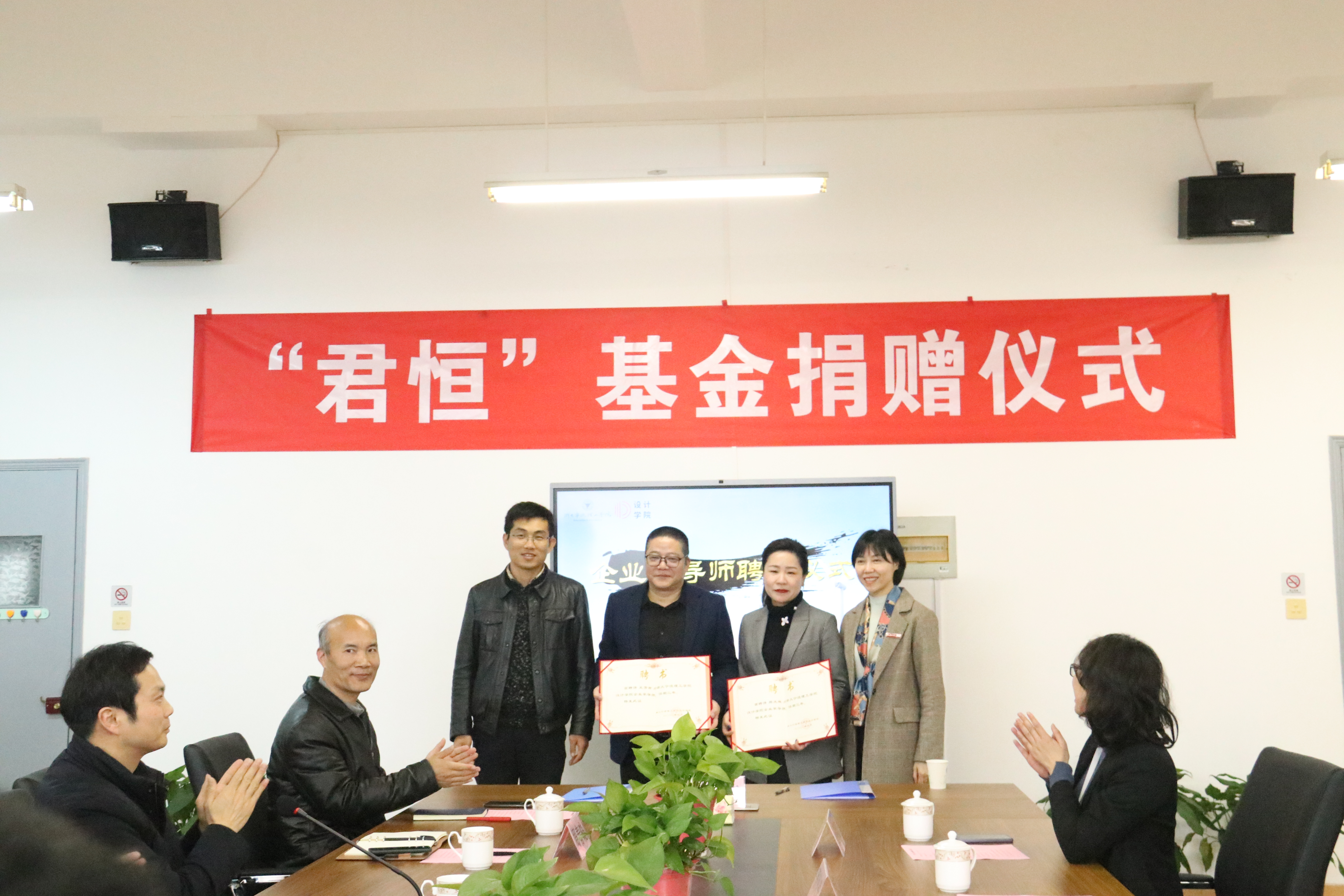 周凤珠与设计学院党委副书记叶卫树签订了“君恒”基金捐赠协议,冯建波为王芳君颁发捐赠证书。校团委书记、学工部副部长周春晓,学校招生就业处副处长、学校教育发展基金会秘书长陈美芳校为王芳君、周凤珠颁发企业家导师聘任证书。