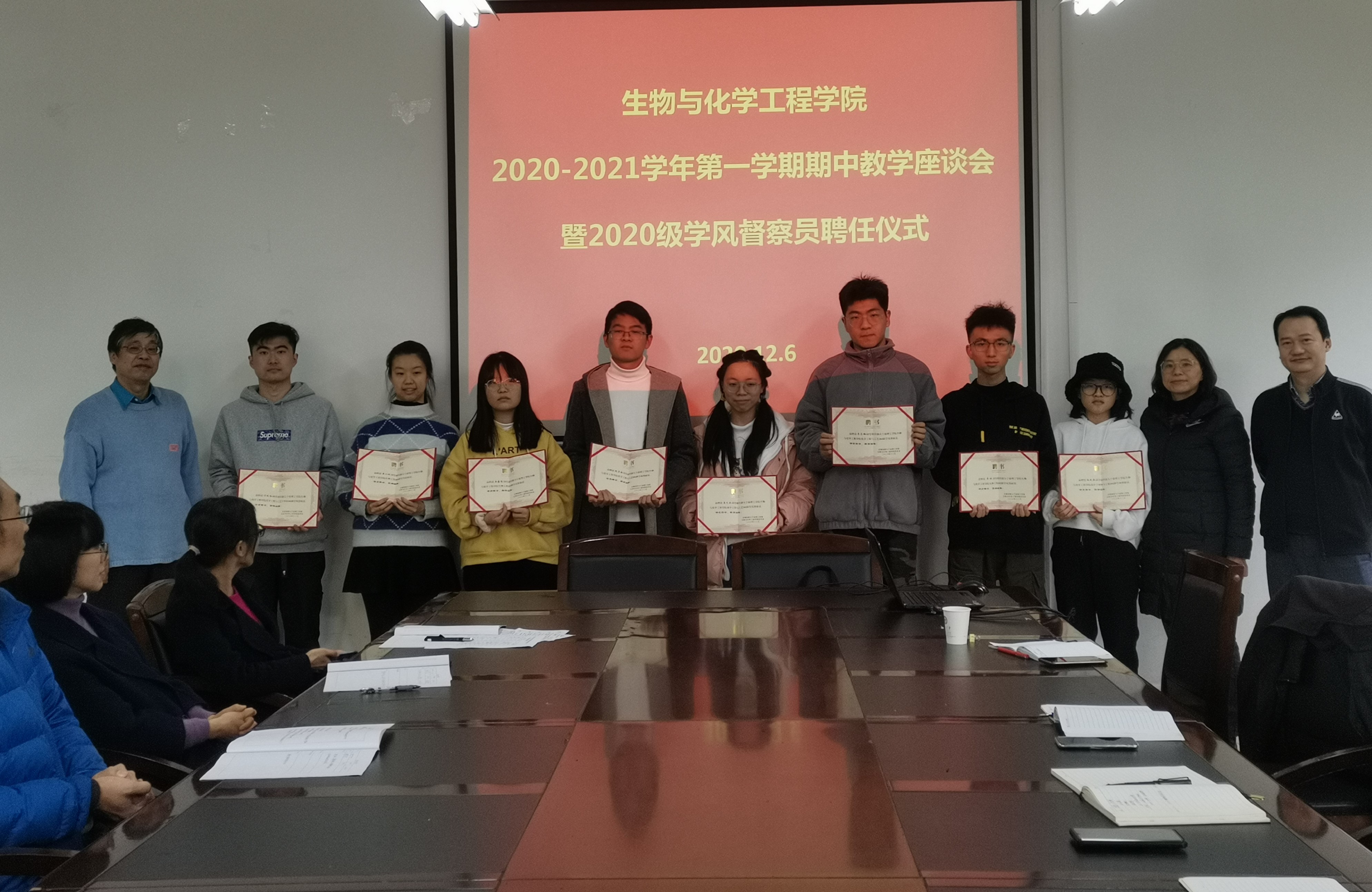 为营造学院良好的学习氛围,全面了解各班的教学情况和学生学习情况,及时发现和解决教学过程中存在的问题,进一步加强班级学风建设,生化学院于2020年12月10日在ND103会议室召开期中教学检查师生座谈会,会议由学院副院长沈昊宇教授主持,出席本次会议的有学校督导郭伟强教授、党委副书记赵涵、各研究所教学副所长、各班的学风督察员以及教务、学工相关老师。