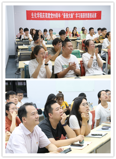 6月28日晚上18:30,在建党99周年即将到来之际,为庆祝党的生日,同时为激发全体党员学习热情,推动学习型支部建设,唱响主旋律、传播正能量、振奋精气神,生化学院举办了“最强大脑”学习强国挑战答题赛,生化学院党委副书记赵涵参加了活动并讲了题为《青春奋斗底色不改,科学报国正当其时》的主题党课,全体学生党员和部分积极分子参加了本次挑战赛。