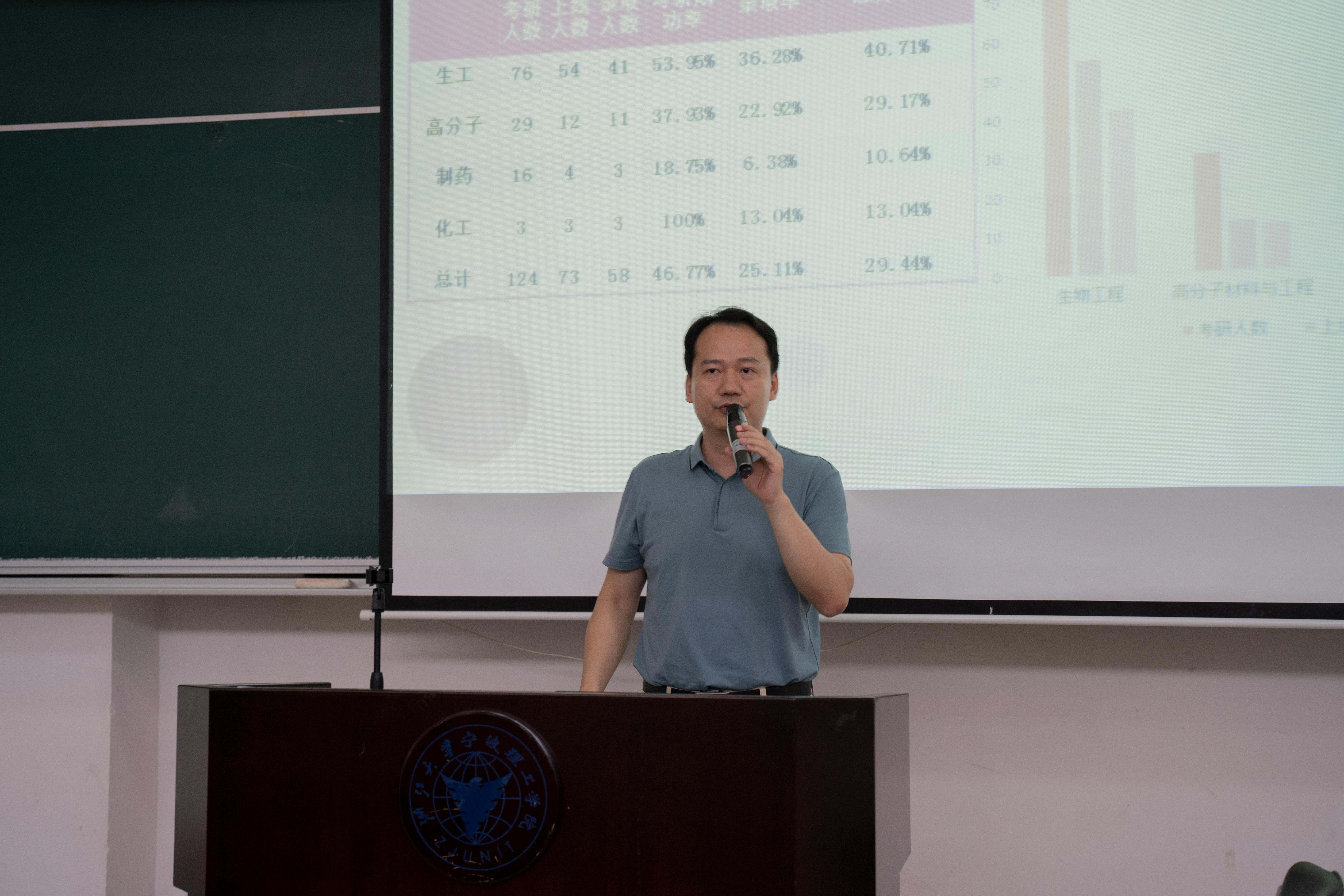 党委副书记赵涵老师围绕考研的重要性、学院近年考研情况、考研准备策略三个方面做了动员讲话,赵老师通过详尽的数据分析和考研政策解析,让同学们切实感受到当下考研大情势,感受到知识可以改变命运的力量。他强调,广大青年要志存高远,作为工科学生要积极践行工匠精神,坚持科学报国理想,要努力寻求更大的发展空间,为将来成为国家栋梁之才不懈奋斗。他结合历年生化学子考研经验,给2021届考研人提出了四点叮嘱:1、要敢想敢做,敢于规划自己的人生,敢于选择考研之路;2、要客观选择,正确进行自我评估,科学选取报考院校,不可好高骛远也不可妄自菲薄;3、要坚持不懈,脚踏实地,持之以恒;4、要广泛交流,学会收集信息和经验分享。