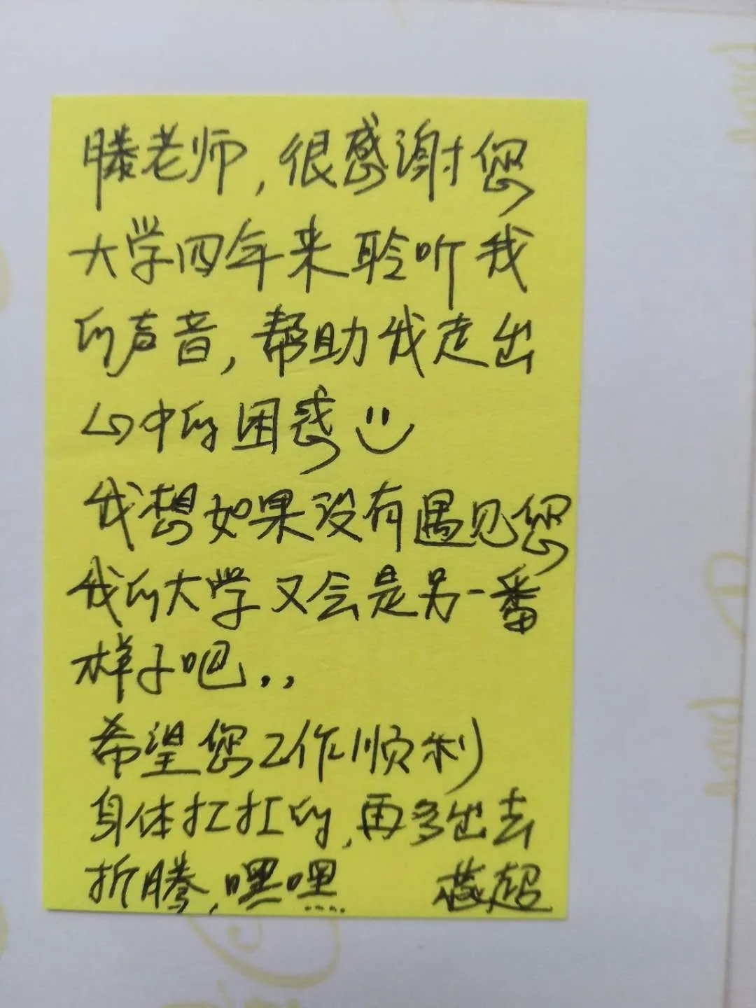 “滕崇老师很像一个循循善诱的长辈。你可以放心地把自己的烦恼讲给她听。”如今回忆起大学里的这段经历,胡燕超依旧无比感谢滕崇老师,“她不会告诉我应该怎么去做,她只是倾听我的烦恼,然后分析,让我自己去考虑该怎么更好地去处理这个问题。”