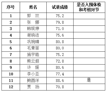 根据《宁波市事业单位公开招聘工作人员实施办法》和《浙江大学宁波理工学院公开招聘事业编制教师的公告》(2019年6月3日)、《浙江大学宁波理工学院公开招聘事业编制教师招聘补充公告》(2019年6月17日),开云2019年公开招聘传媒学院事业编制教师的试讲工作已经结束,现将试讲成绩予以公布。按照本次招考公告规定,根据试讲成绩从高分到低分按招考计划1:1的比例确定体检和考核对象。